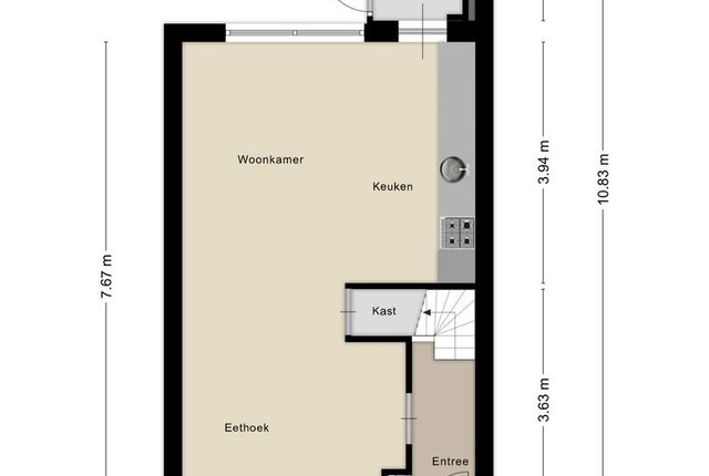 Via de entree kom je in de hal, waar zich de meterkast, trapopgang en de toegangsdeur naar de woonkamer bevinden. Deze lichte woonkamer heeft grote ramen in de voor- en achtergevel. De open keuken is royaal maar wel eenvoudig van opzet. Vanuit de keuken kom je in de bijkeuken met opstelplaats voor witgoed, de separate toiletruimte en toegang naar de kleine achterplaats.