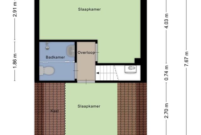 Op de eerste verdieping bevinden zich 2 slaapkamers en de badkamer. De eerste slaapkamer ligt aan de voorzijde van de woning, terwijl de andere twee slaapkamers aan de achterzijde zijn gesitueerd. De centraal geplaatste badkamer is voorzien van een douche en een wastafel.