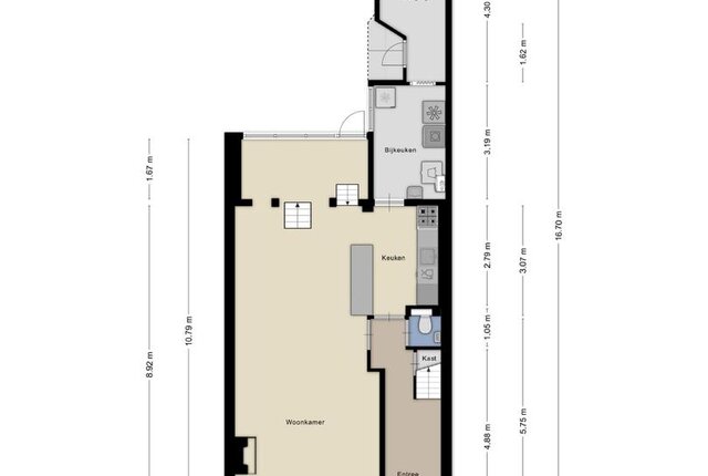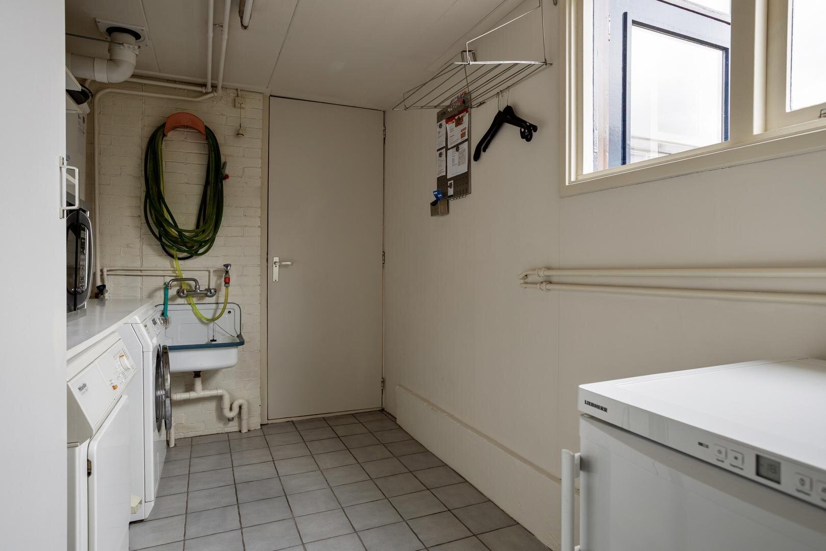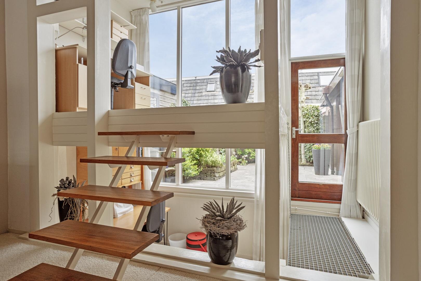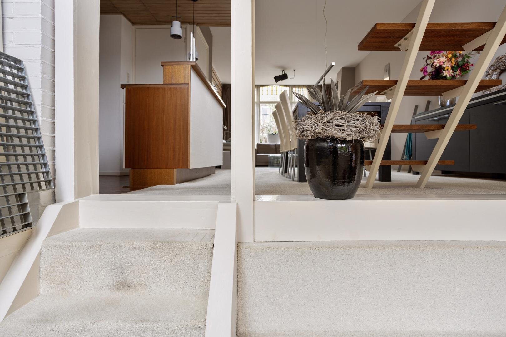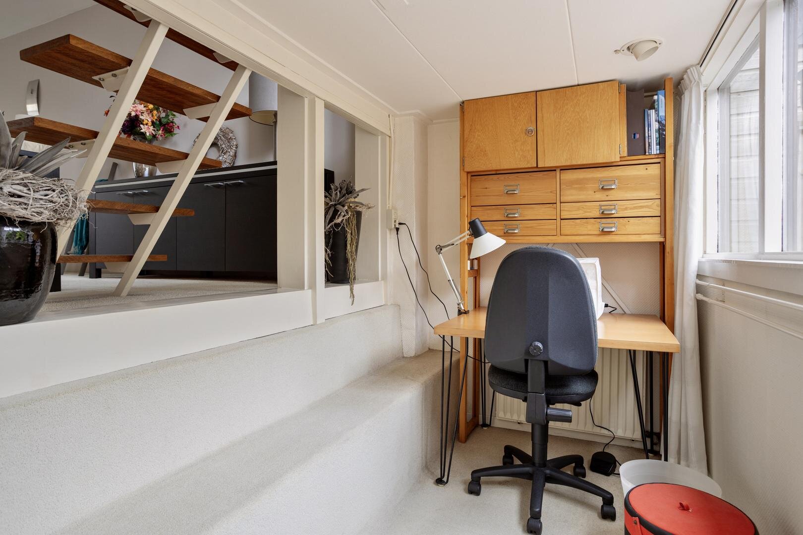 Begane grond: entree, gang, meterkast, trapopgang, toilet. Ruime doorzonkamer met grote raampartijen in de voor- en achtergevel en een schouw. In de achterkamer bevindt zich een aanbouw welke zich gedeeltelijk onder en boven het maaiveld bevindt. Hierdoor is op een hele vernuftige wijze extra woon/werkruimte toegevoegd. Half open keuken met inbouwapparatuur. Doorloop naar de bijkeuken met cv-ruimte en opstelplaats voor de wasmachine en de droger. Doorloop naar de berging en de achtertuin.