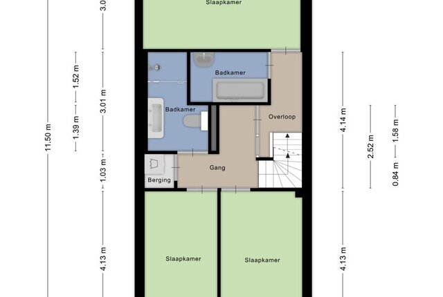 Overloop met aangrenzend 3 ruime slaapkamers (waarvan 1 aan de achterzijde over nagenoeg de volle breedte van de woning) en een dubbele badkamer. De ene badkamer heeft een ligbad en vaste wastafel en de andere is net gerenoveerd en voorzien van een inloopdouche, wastafel en 2e toilet. Op de overloop bevindt zich nog een inbouwkast met aansluiting voor de wasmachine of droger. Vaste trap naar: