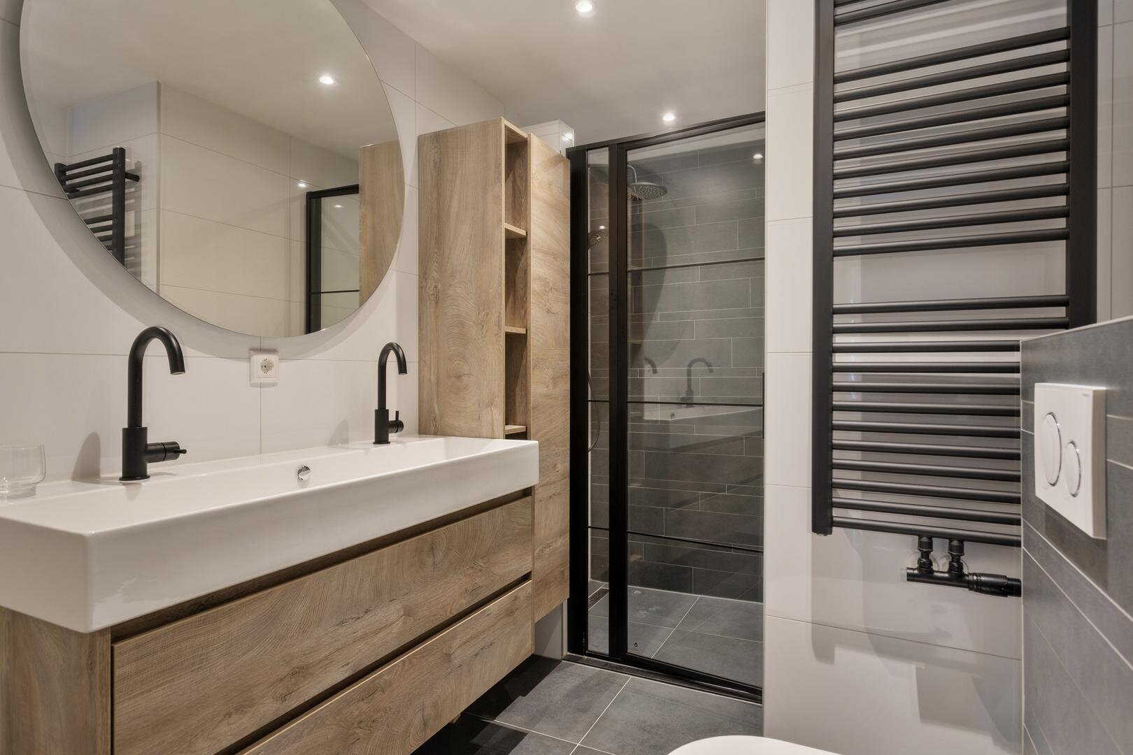 Overloop met aangrenzend 3 ruime slaapkamers (waarvan 1 aan de achterzijde over nagenoeg de volle breedte van de woning) en een dubbele badkamer. De ene badkamer heeft een ligbad en vaste wastafel en de andere is net gerenoveerd en voorzien van een inloopdouche, wastafel en 2e toilet. Op de overloop bevindt zich nog een inbouwkast met aansluiting voor de wasmachine of droger. Vaste trap naar: