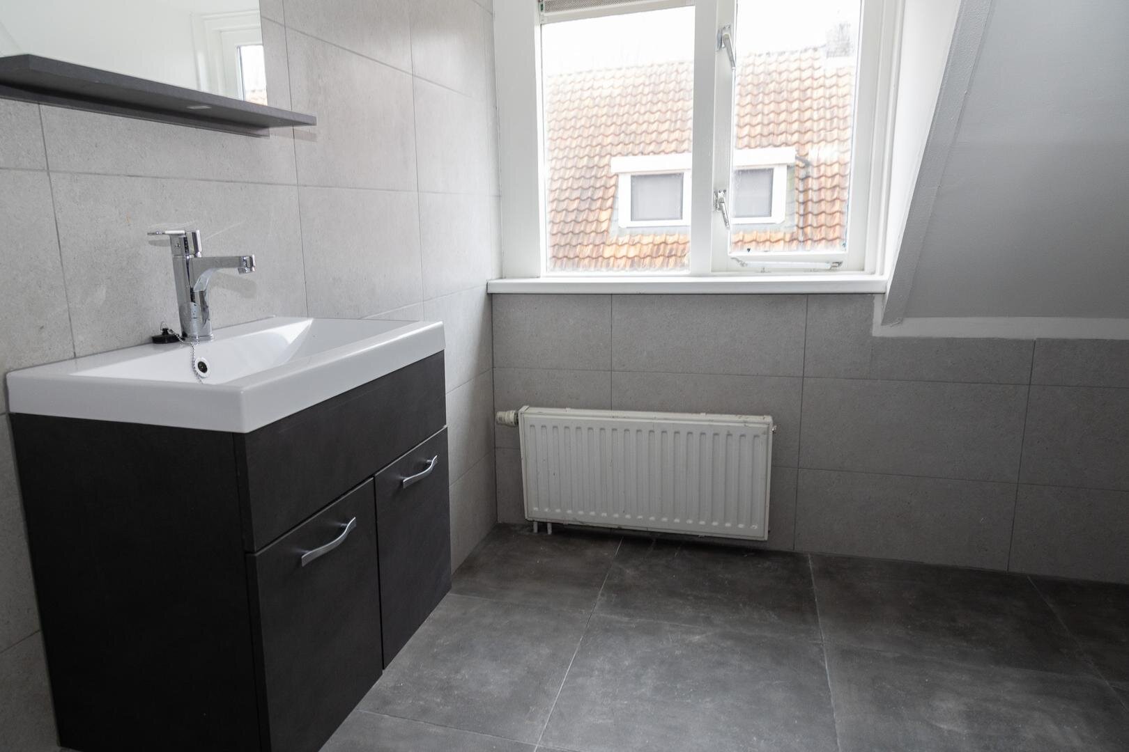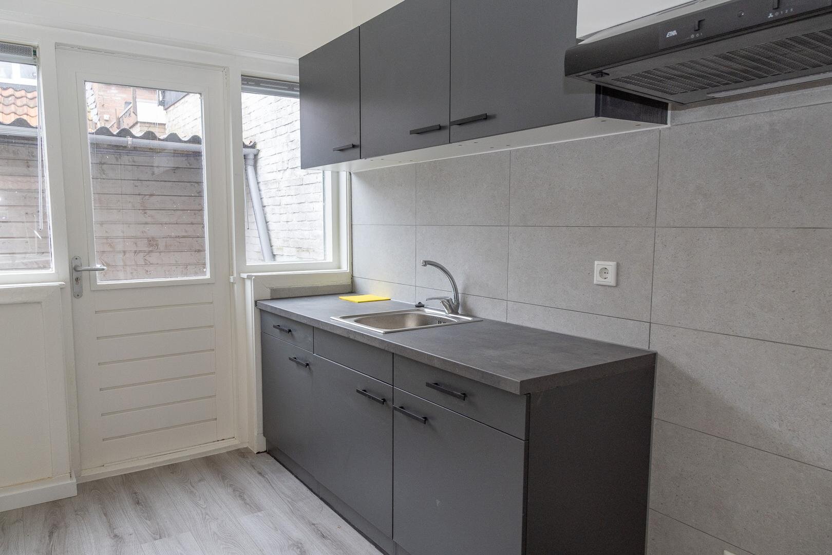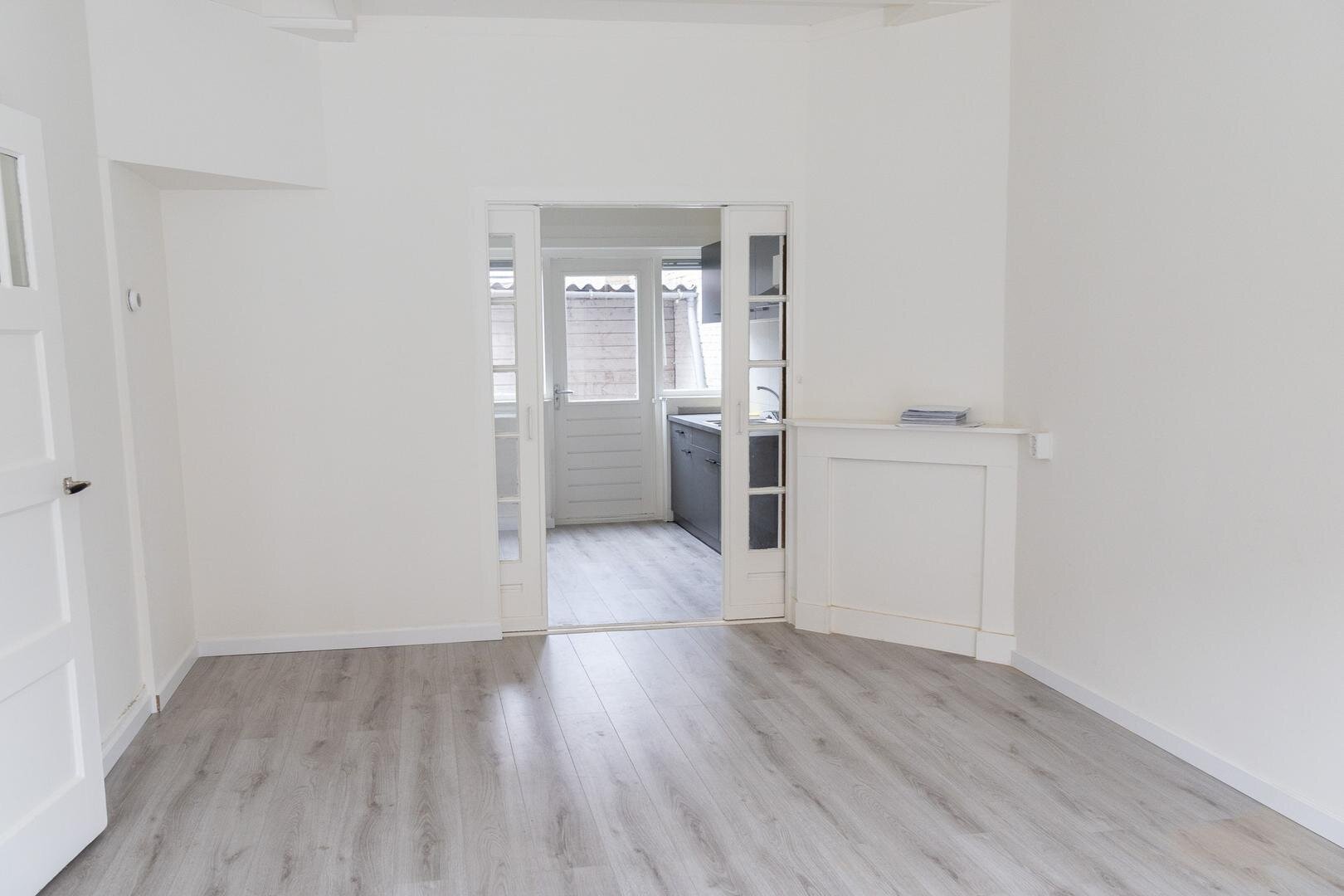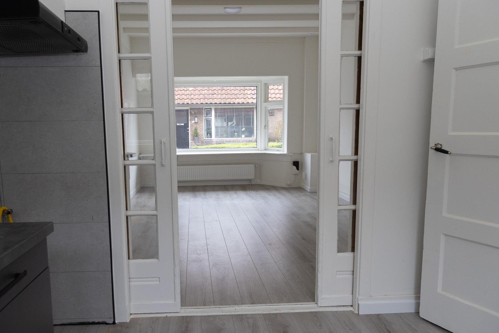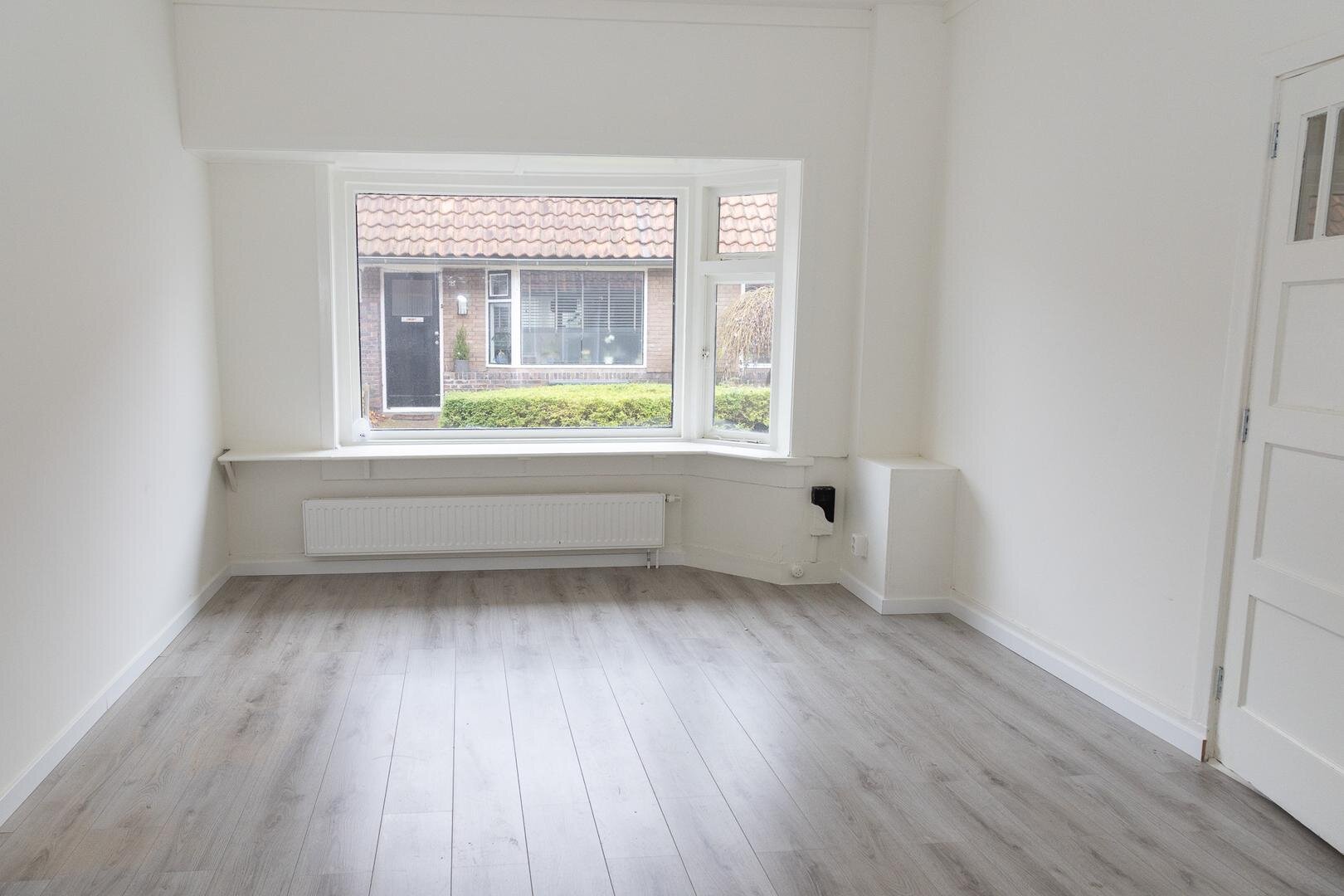Nabij het stadscentrum nette zelfstandige woonruimte met voor- en achtertuintje, 2 slaapkamer, een keurige badkamer, moderne open keuken en een mooie lichte woonkamer met erker en schuifdeuren.