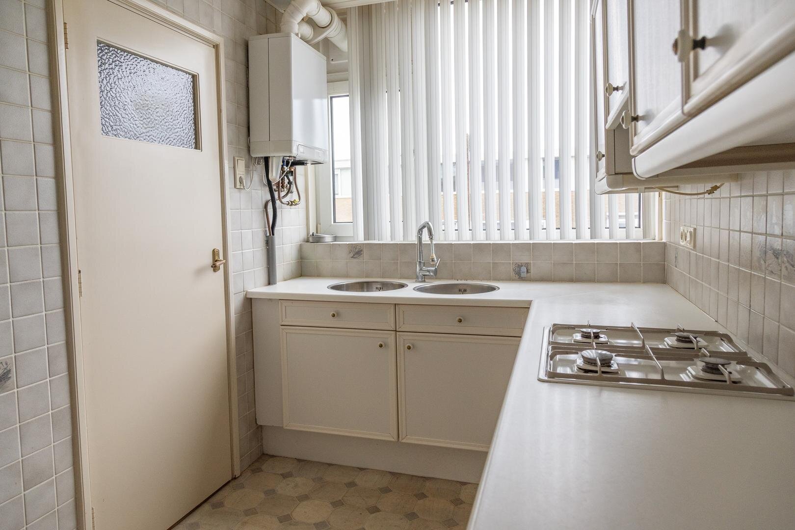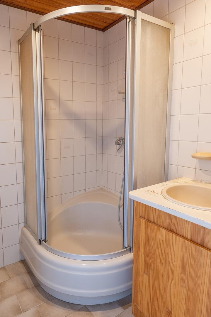 De dichte keuken is ruim van opzet en er is veel licht door een groot kozijn in de zijgevel. De keuken is voorzien van een 4 pits gaskookplaat, een oven en een afzuigkap. Vanuit de keuken heb je toegang tot de royale doucheruimte met vaste wastafel en mogelijkheid voor het opstellen van de wasmachine