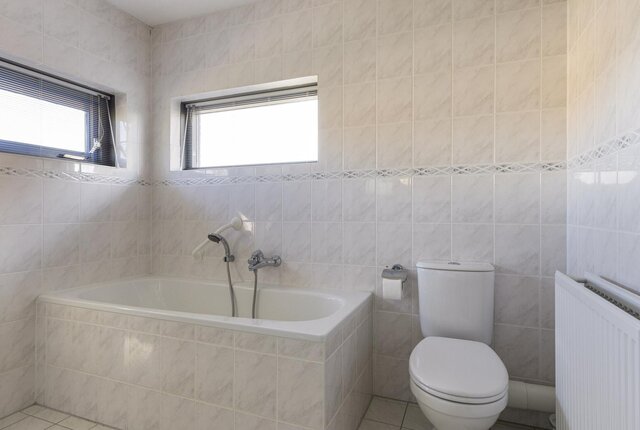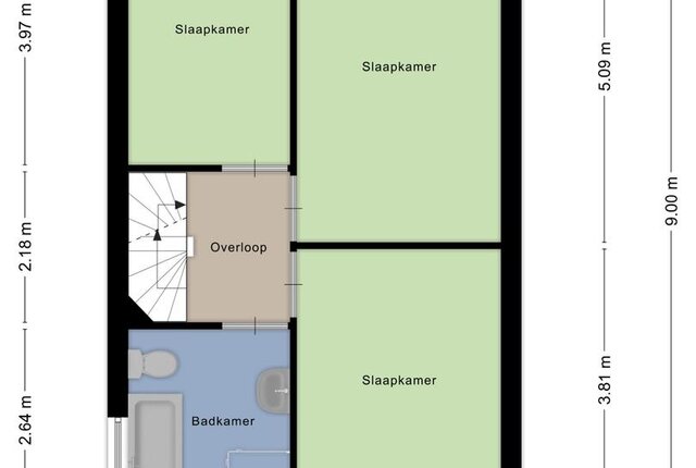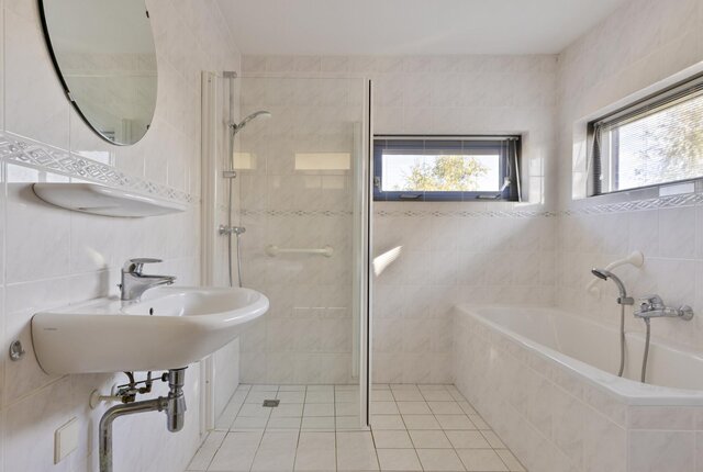 op de eerste verdieping beschikt de woning over 3 ruime slaapkamers en de badkamer. De badkamer is voorzien van een toilet, ligbad, douche en wastafel. De master bedroom is 15m2 en de tweede en derde slaapkamer resp. 12m2 en 9m2.